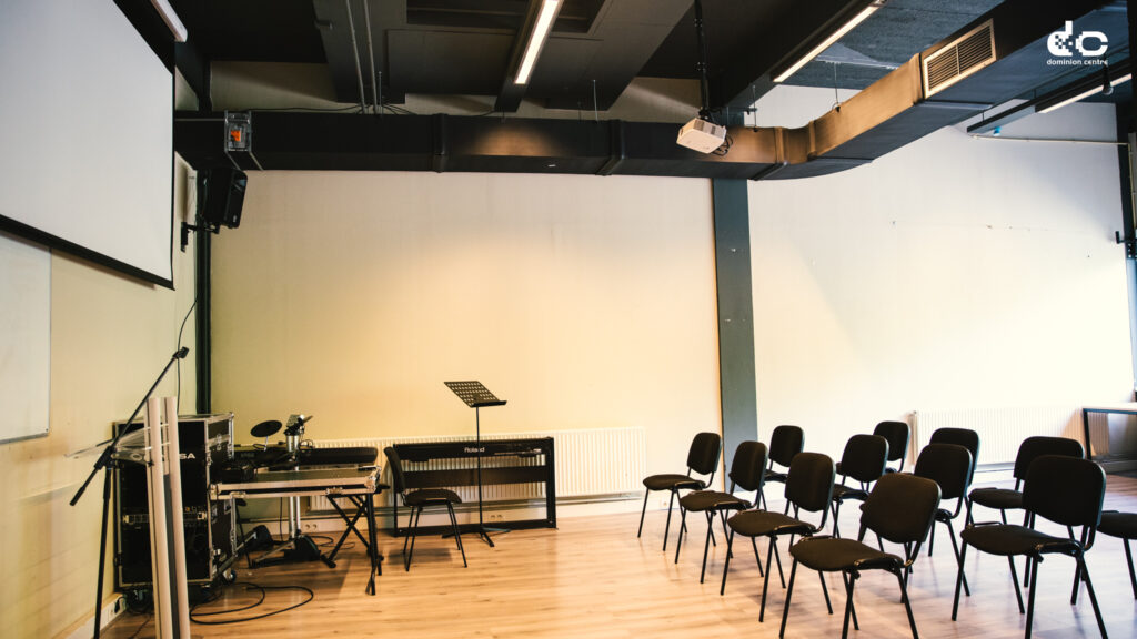 De oefenruimte in het Dominion Centre is volledig uitgerust met microfoons, een drumstel, en een…